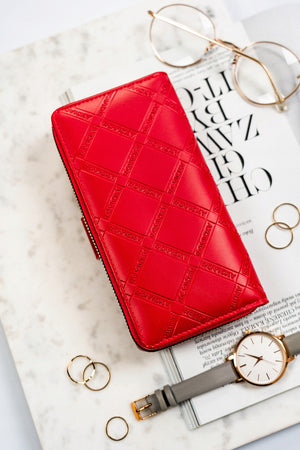 Šis sieviešu maks izceļas ar savu eleganto un stilīgo dizainu. Sarkanā krāsa ar monogramas rakstu rada ekskluzivitātes un greznības iespaidu.