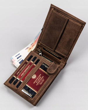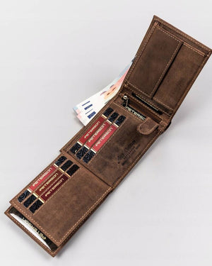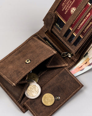 Šis elegantais maks, kas izgatavots no augstas kvalitātes dabīgas zamšādas un nubuka ādas, ir lieliska izvēle vīriešiem, kuri novērtē stilu un funkcionalitāti. Brūnais dizains nodrošina klasisku un daudzpusīgu izskatu, kas piemērots dažādiem gadījumiem.