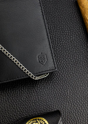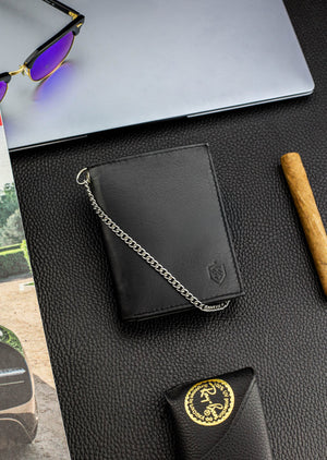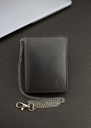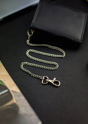 Šis vīriešu ādas maks ir ne tikai stilīgs, bet arī funkcionāls. Tas ir izgatavots no augstas kvalitātes īstas kazas ādas, un tā dizainu papildina 50 cm gara metāla ķēdīte ar karabīni papildu drošībai.