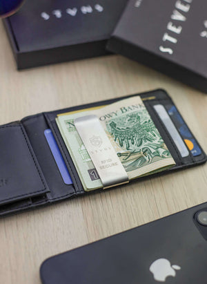 - Banknošu klipsis: Nerūsējošā tērauda klipsis nodrošina banknošu drošu glabāšanu.