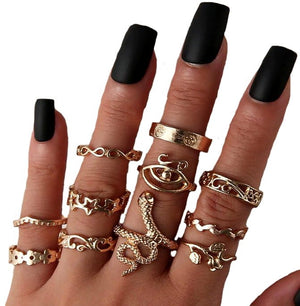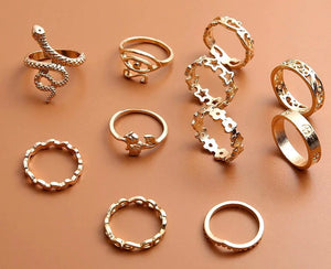 Šis 11 gredzenu komplekts ir īsts hits, izgatavots no metāla un pārklāts ar zeltu. Katrs gredzens izceļas ar unikālu dizainu, tostarp gredzeni čūskas formā un dekorēti ar ķeltu rakstiem.
