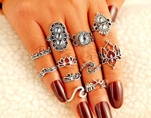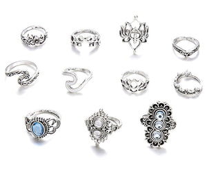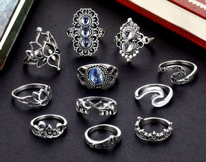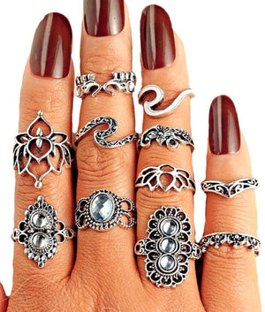 Šis unikālais gredzenu komplekts, kas sastāv no 11 elementiem, ir lieliska izvēle tiem, kas novērtē stilīgus un oriģinālus aksesuārus. Gredzeni ir izgatavoti no metāla, tiem ir mūžīga sudraba krāsa, un tos var nēsāt gan kopā, gan atsevišķi.