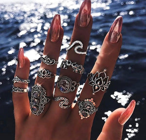 Komplektā ietilpst dažādi gredzeni, tostarp laulību gredzeni, kas imitē čūsku, un tādi, kas dekorēti ar ažūra ziediem un sintētiskiem cirkoniem. Šis pankroka stila gredzenu komplekts ir lieliska izvēle pusaudžiem, kas meklē modernus un rūpīgi izstrādātus aksesuārus.
