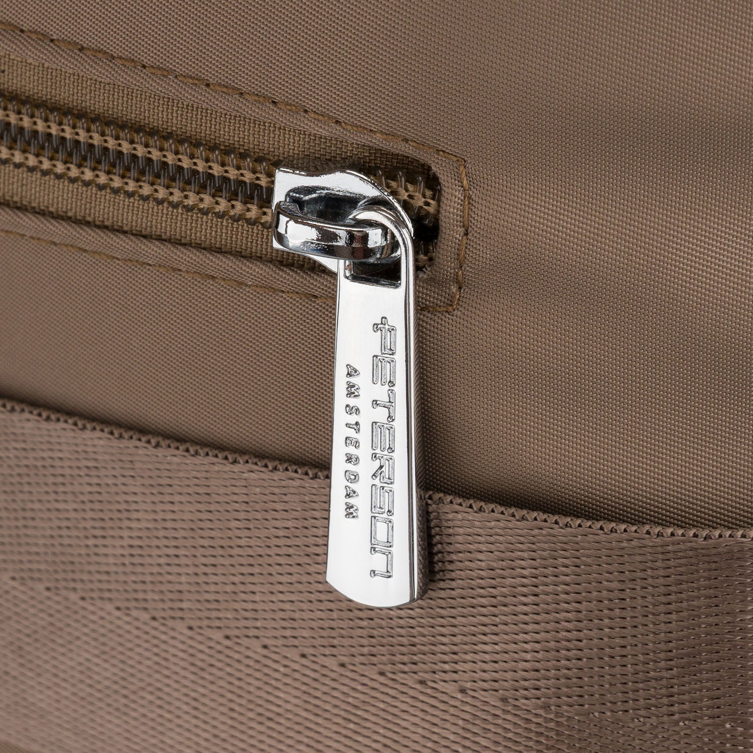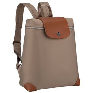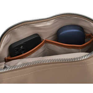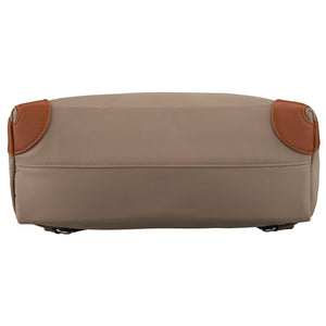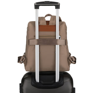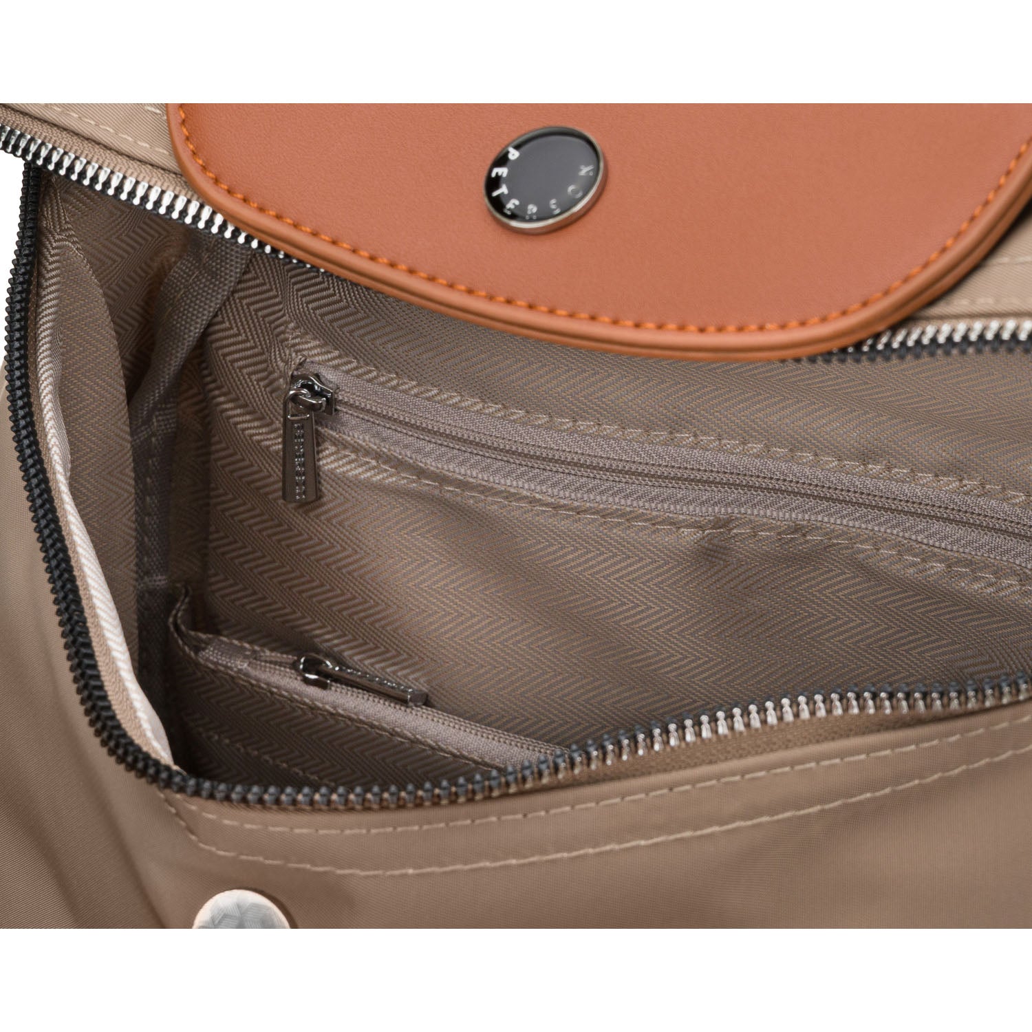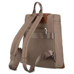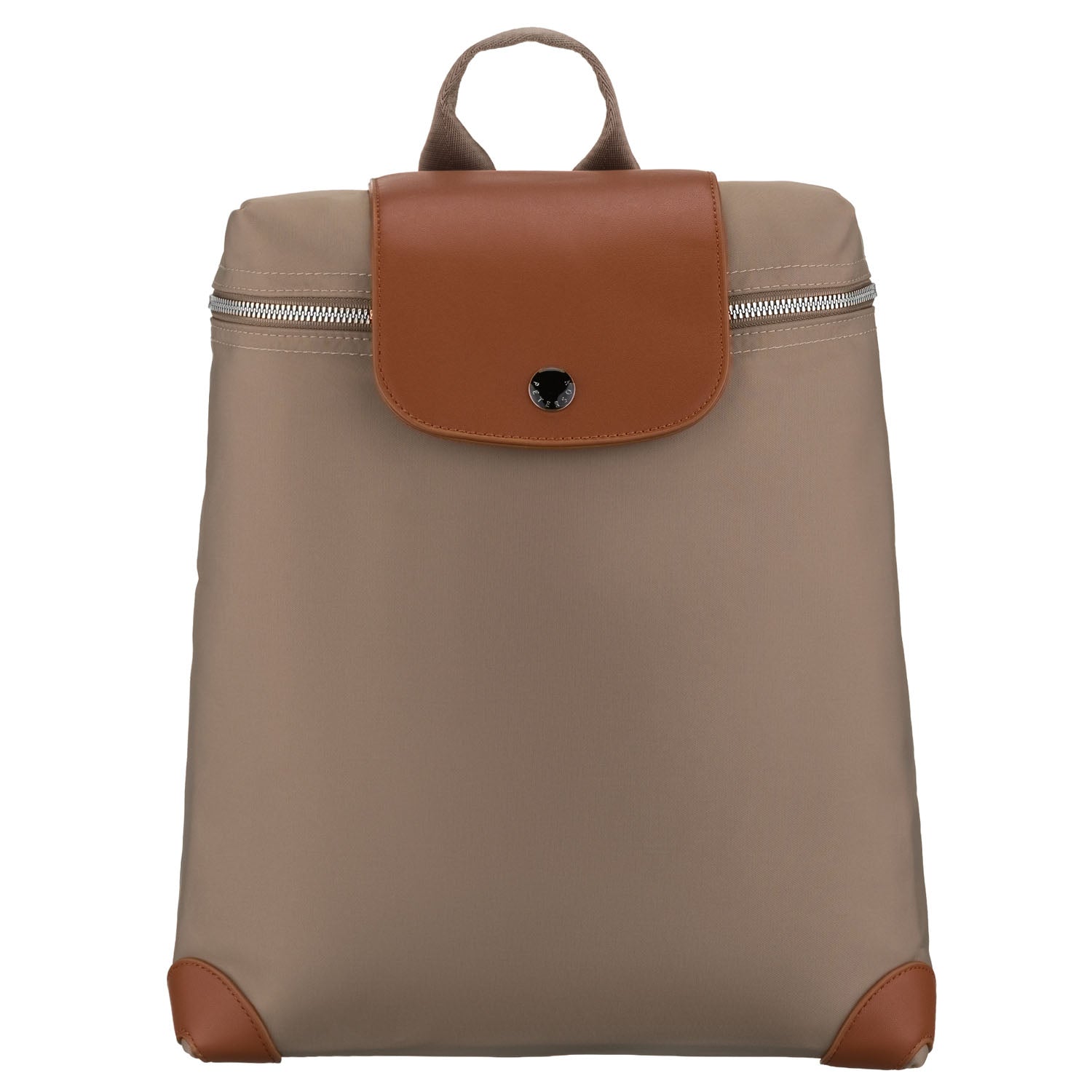 Mažas moteriškas Peterson kuprinė iš poliesterio – rudas, tamsiai smėlio atspalvio miesto kuprinė kasdieniam naudojimui.