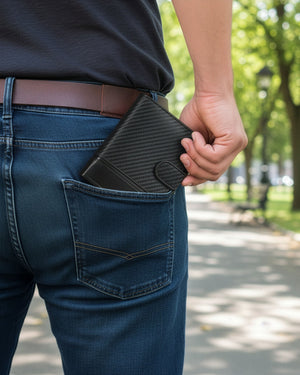 Vertikāls vīriešu maks ikdienas lietošanai. Izgatavots no kvalitatīvas dabīgas ādas, kuras virsma pārklāta ar speciālu tehnisku slāni, vizuāli atgādinošu karbona struktūru. Pateicoties tam maks izskatās moderns un ir izturīgāks pret skrāpējumiem un nodilumu.