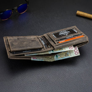 Horizontāls vīriešu maks, izgatavots no augstas kvalitātes dabīgās teļādas brūnā (nubuka tipa) tonī. Kompakts, ietilpīgs un ērts ikdienas lietošanai. Izmēri: 12,5 × 10,5 × 2,5 cm.