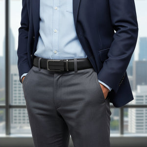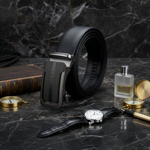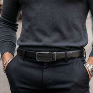 Automātiskā sprādze izgatavota no metāla sakausējuma ar matētu melnu pārklājumu. Minimālistisks, tīrs dizains bez liekām detaļām piešķir jostai modernu un stabilu raksturu, lieliski sader gan ar klasisko, gan ikdienas stilu.